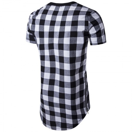 Summer New Men's High Street Long Check Double Side Zipper Round Neck Short Sleeve T-Shirt